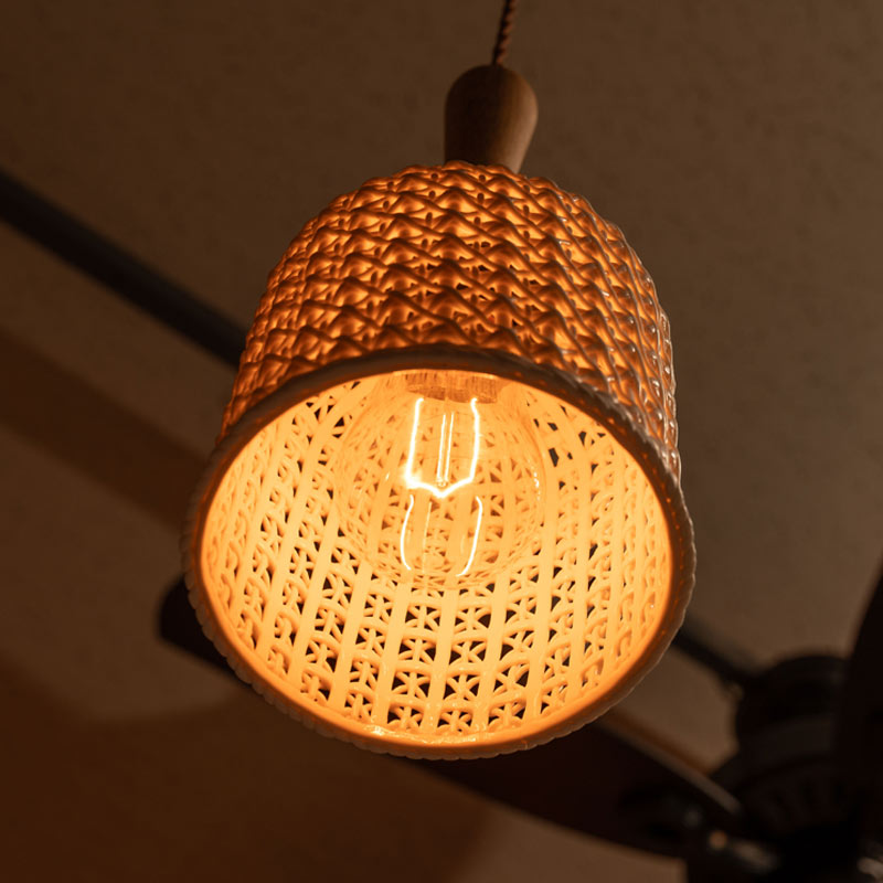 消灯時にはなめらかな陶器のデザインを楽しめ、点灯時は優しい光でぬくもりのある空間を演出します。