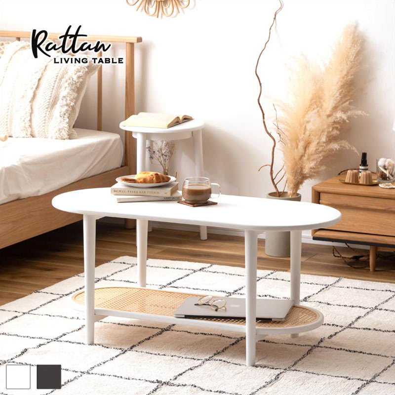 ラタン調の棚がアクセントのリビングテーブル