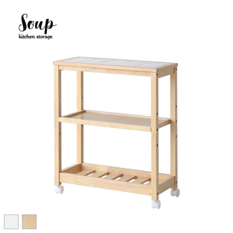 キッチンアイテムなど小物の収納に最適なタイル天板のスリムワゴンです。