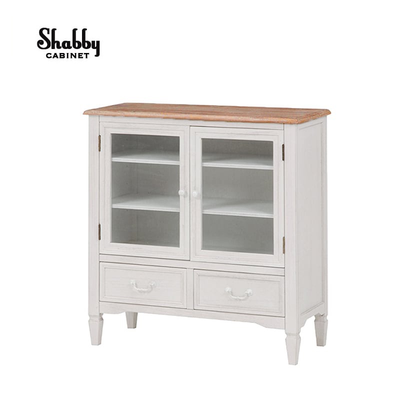 優しいアンティークホワイトとナチュラル天板の組み合わせがかわいいキャビネット。