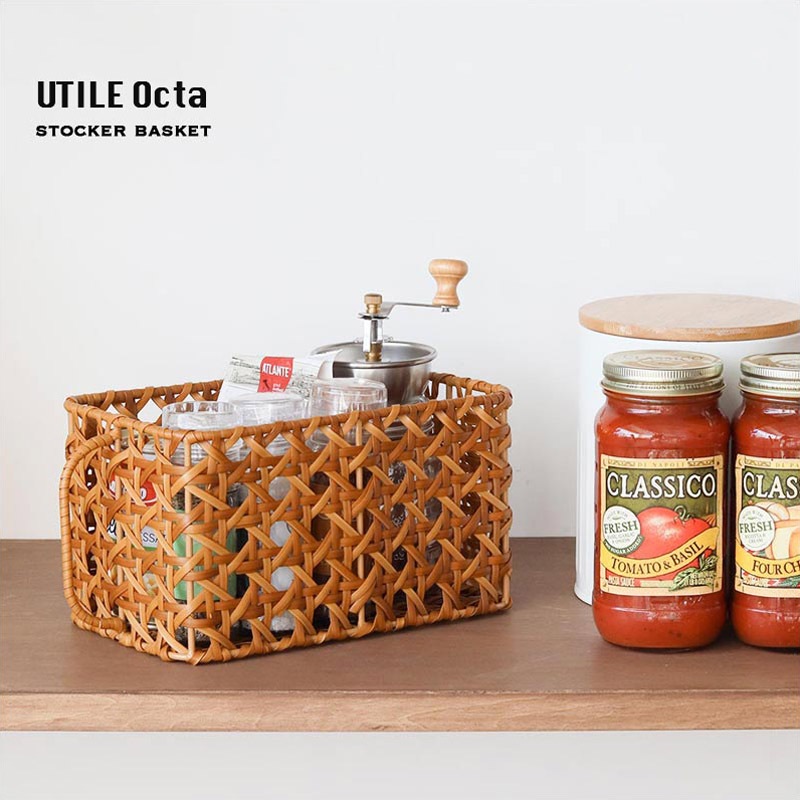 バスケットの深さは約13.5cmで、ティーウェアのストックとして、スパイス調味料の整理などに便利なサイズです。