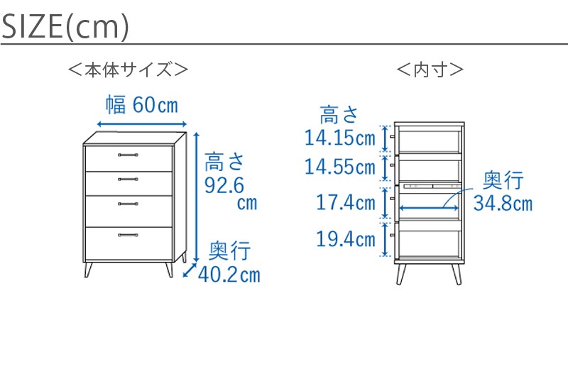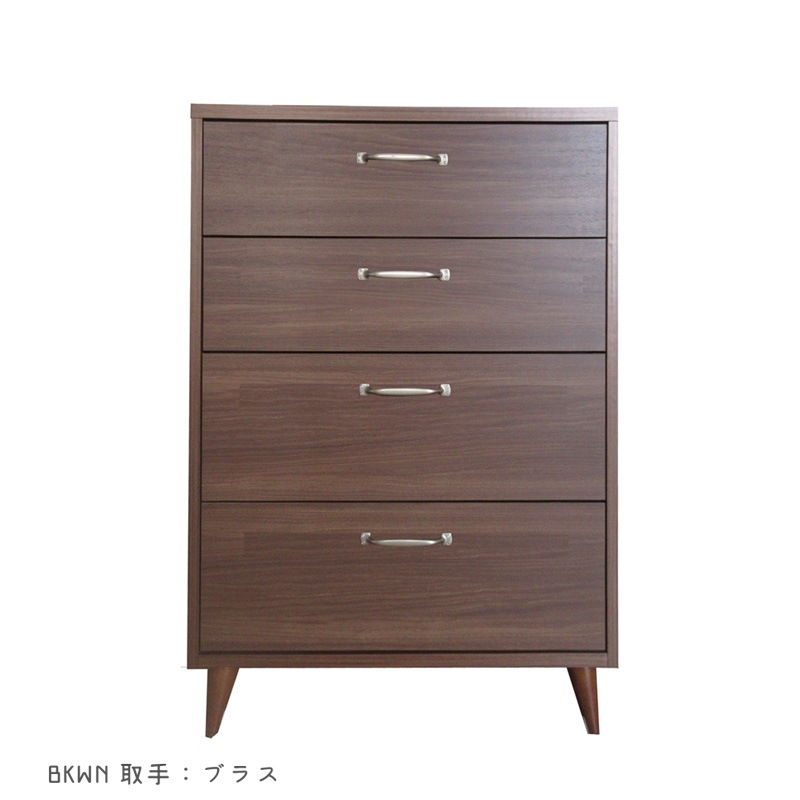 上2段と下2段でサイズが違う、コンパクトなサイズにまとまったチェストです。ベースの色と取手の色をお好みで組み合わせ、シンプルながらオリジナリティのあるチェストを楽しんでみて下さい。