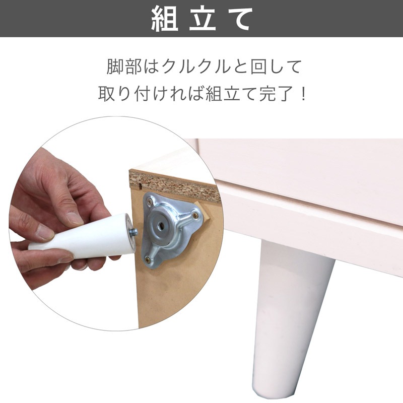本体:完成品 脚部取付式 取手(4個)取付式 ※プラスドライバーをご用意下さい。 引き出し:スライドレールローラータイプ付 背面化粧 日本製 配送サイズ C サイズ 配送料金表はこちら ※受注生産の為、お届けまで多少お時間を要しますことをご了承下さいませ。 |