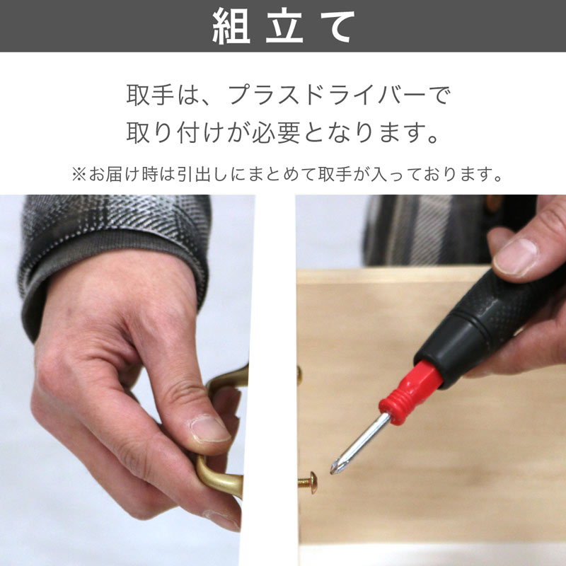 こちらの商品は本体は完成品でお届けします。 脚部をねじ込み式で取付けと取手をプラスドライバーで取付けになります。