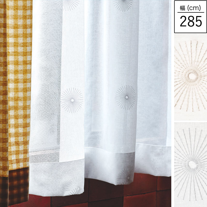 光と花をイメージしたサークルデザインの刺繍レース、色を同系にしており大胆なデザインでもインテリアに溶け込みます。