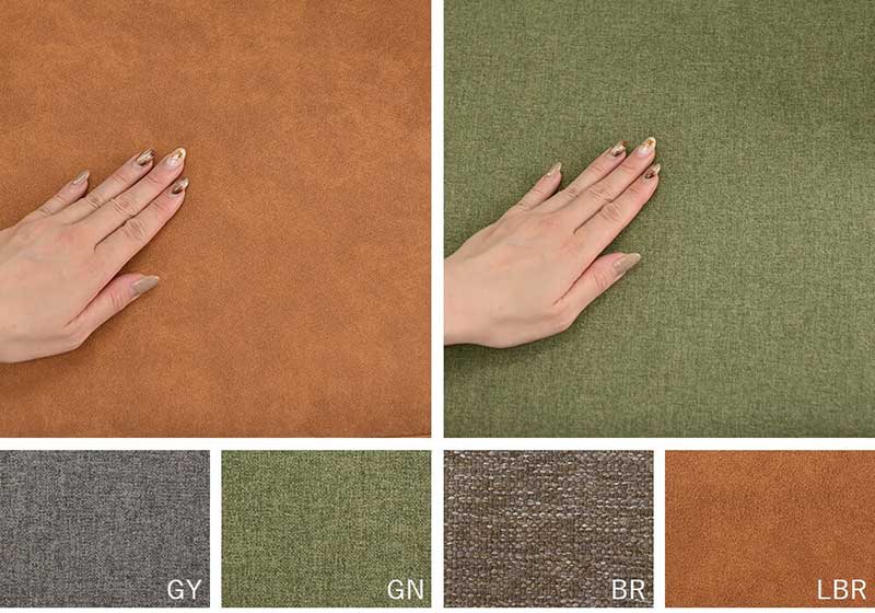 座面と背もたれクッションのカラーは、グレー・グリーン・ブラウン(ともにファブリック)・ライトブラウン(人工レザー風)の4カラーになります。